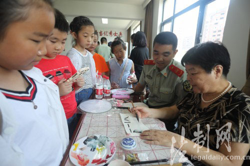 ????為慶祝建軍90周年,7月26日上午,在“八一”建軍節即將來臨之際,舟山市定海區昌國街道夕陽紅書畫攝影協會的七位老藝術家和翁山社區的十幾位小朋友一起走進浙江邊防總隊舟山邊防支隊,開展“情系夕陽紅,警民魚水情”慰問活動,受到了官兵們的熱烈歡迎。