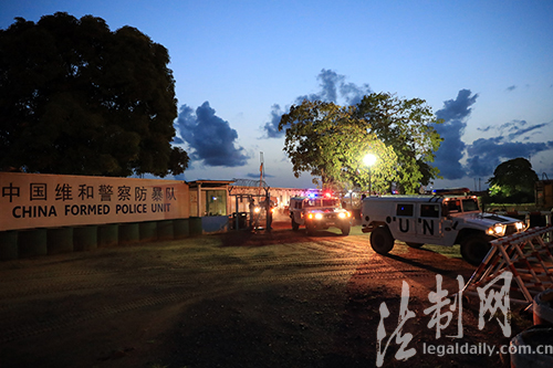 圖為天色漸暗,中國維和警察防暴隊巡邏組乘車駛出營區