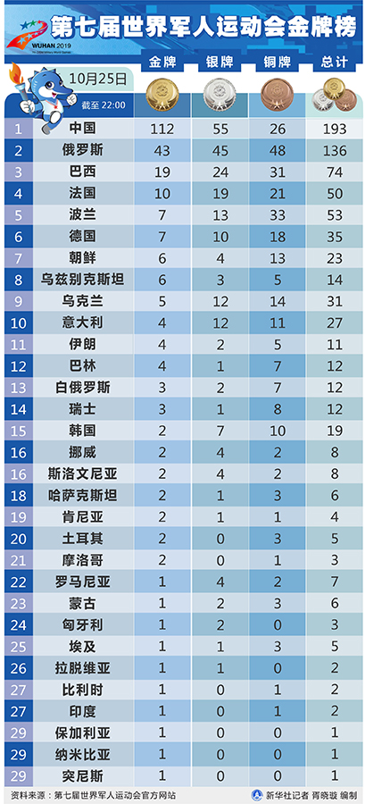 新華社武漢10月25日電(記者王恒志 梁建強)112金!中國軍團25日在武漢舉行的第七屆軍運會上實現了金牌破百、獎牌近兩百的優異戰績。當日中國軍團在田徑、跳水、體操、射擊、海軍五項、拳擊等多個項目上迎來爆發,單日收獲24金。