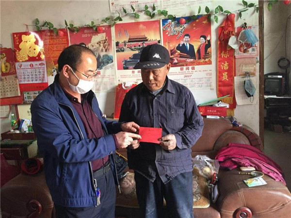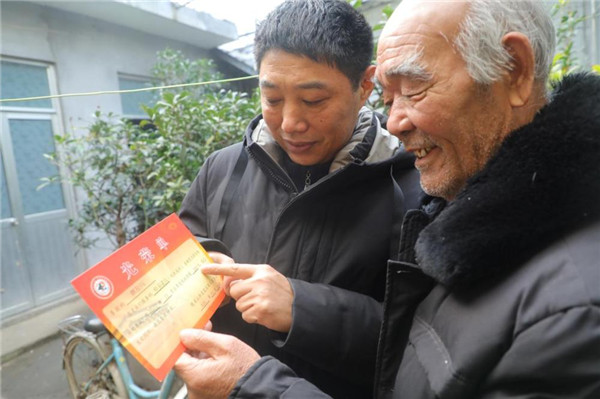 ????費縣胡陽鎮退役軍人服務站站長張中方為優撫對象送光榮單。李永臣 攝