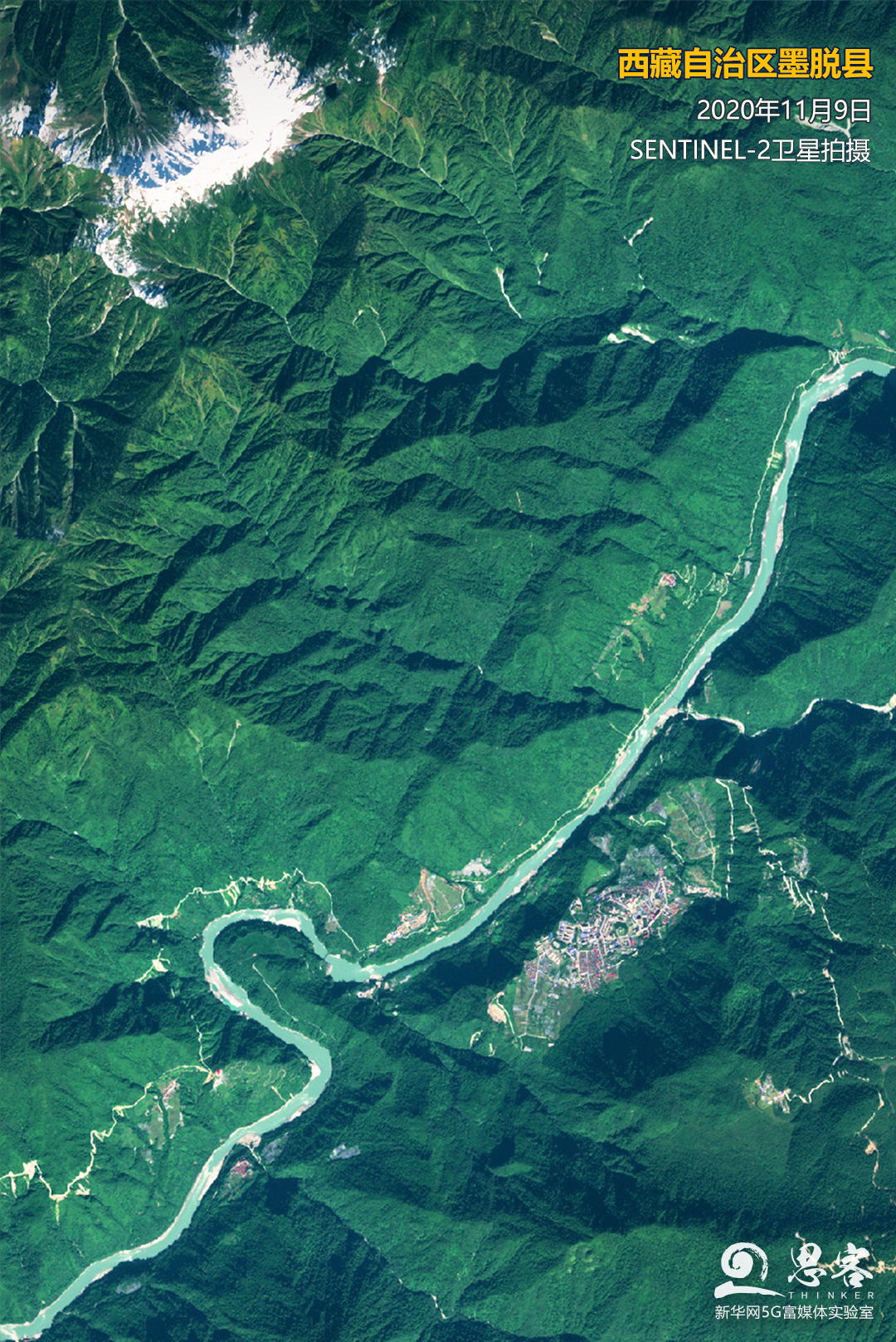▲鑲嵌在雅魯藏布江峽谷深處的“秘境”墨脫。衛星數據來源:SENTINEL-2