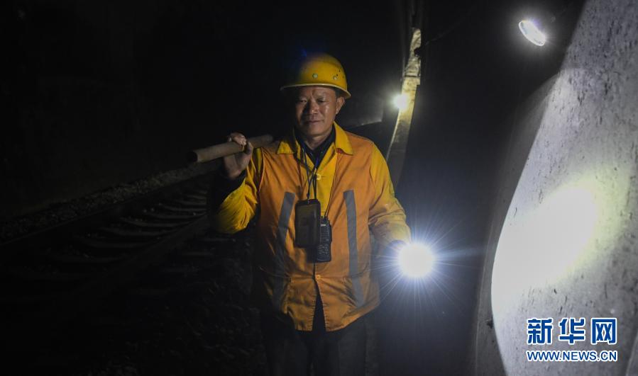 在廣西河池境內黔桂鐵路線上的鄧山隧道,中國鐵路南寧局集團有限公司柳州工務段的4名看守工輪換值班,依靠手電筒在黑暗中穿行,及時巡查隧道中可能出現的各種隱患,確保每天經隧道運行的59趟客貨列車春運安全。鄧山隧道全長773米,是一個需要人員全天候看守的鐵路隧道。