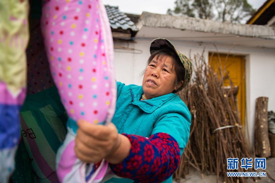 1月29日,在湖南省瀘溪縣浦市鎮麻溪口村,楊玉英在晾曬兒子床上的被褥。