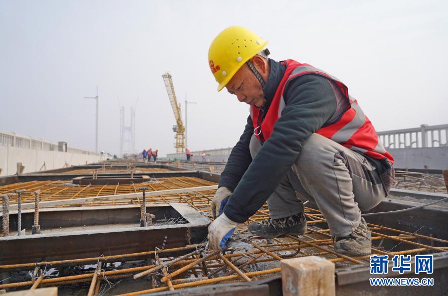 江洪良在安九高鐵江西段長江特大橋施工現場扎鋼筋(2月4日攝)。