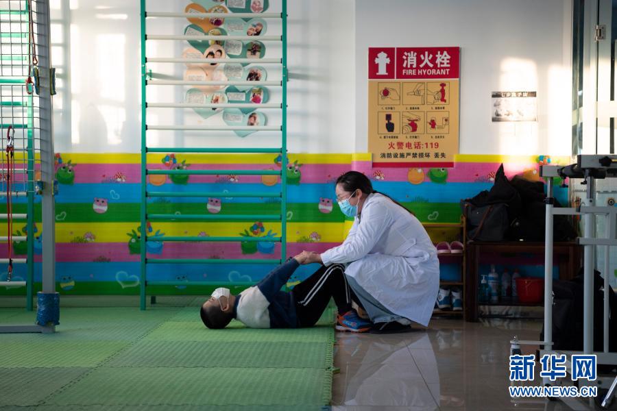 在哈爾濱博能中醫門診部,劉雨晴為腦癱兒童進行康復訓練(2月2日攝)。