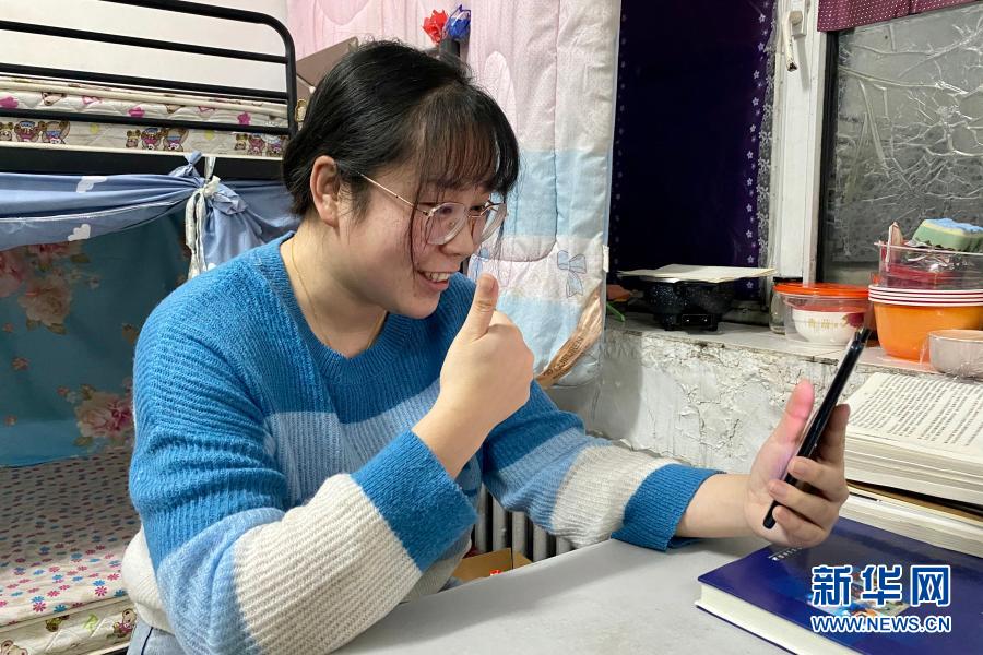 2月10日,在哈爾濱市平房區的宿舍里,劉雨晴在線上指導腦癱兒童進行康復訓練(手機照片)。