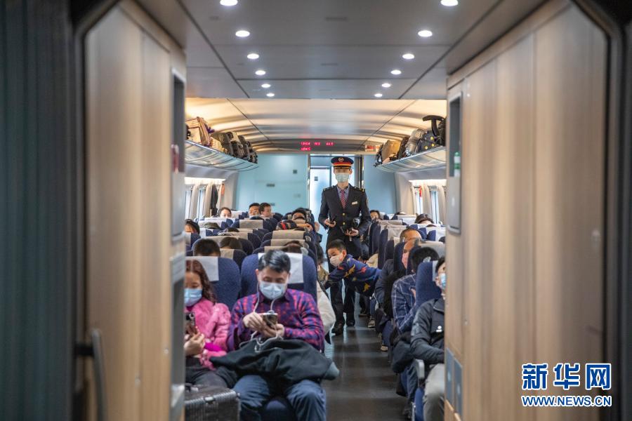 2月9日,付寶印在重慶北開(kāi)往萬(wàn)州北的C6422次列車(chē)上巡視車(chē)廂。新華社記者 黃偉 攝