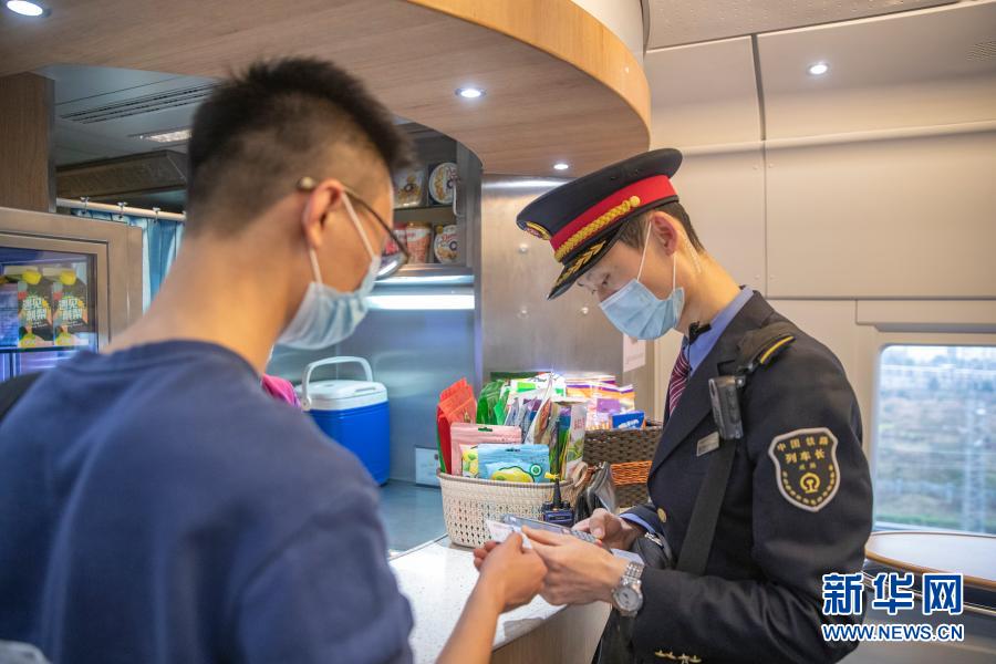 2月9日,在重慶北開往萬州北的C6422次列車上,付寶印為一名旅客辦理補票業務。新華社記者 黃偉 攝