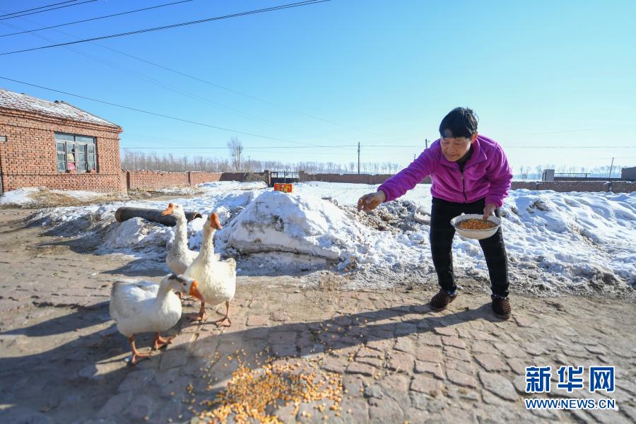 2月9日,在吉林省長春市農安縣楊樹林鄉牛尾巴山村,付寶印的母親鐘士輝在喂鵝。新華社記者 張楠 攝