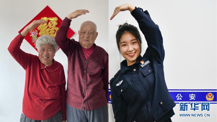 拼版照片:左圖為2月11日,在河北邯鄲居住的楊曉惠的爺爺與奶奶在家中比心(王洪超 攝);右圖為2月11日,楊曉惠在天津市紅橋區芥園派出所比心(孫凡越 攝)。