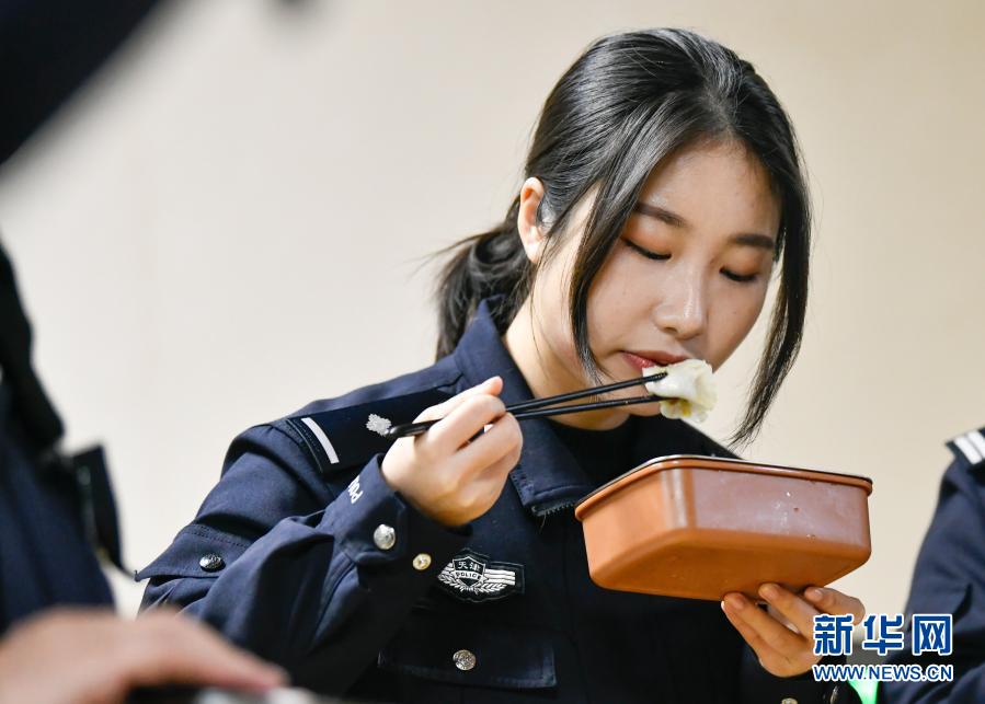 2月11日,在天津市紅橋區芥園派出所的餐廳,在崗位上過年的楊曉惠品嘗單位準備的餃子。新華社發(孫凡越攝)