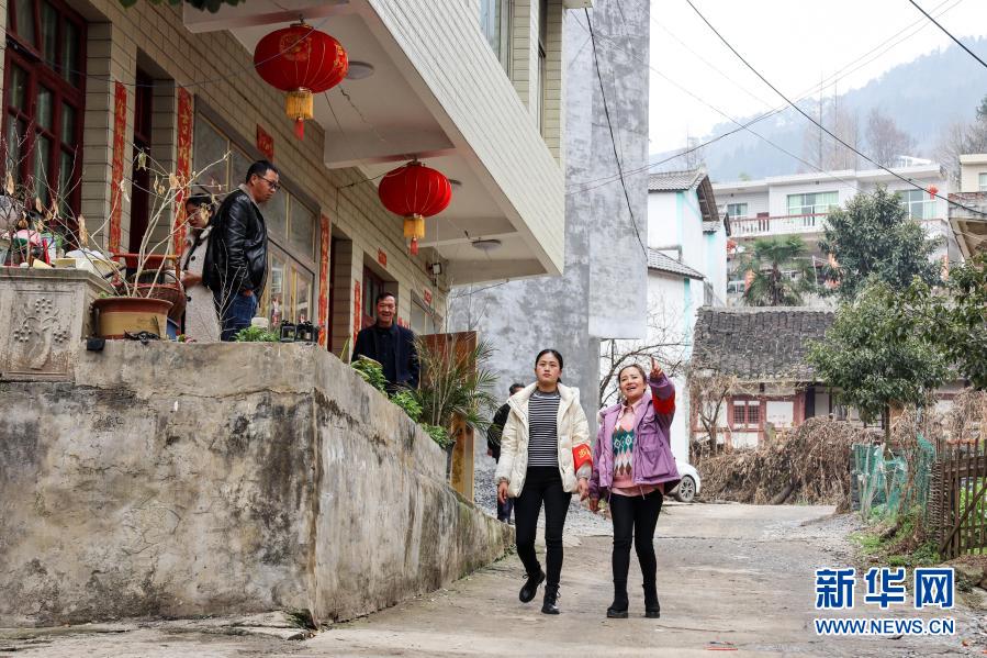 2月13日,吳窮(右一)和村干部吳洪梅在坪子社區走訪。新華社記者 歐東衢攝