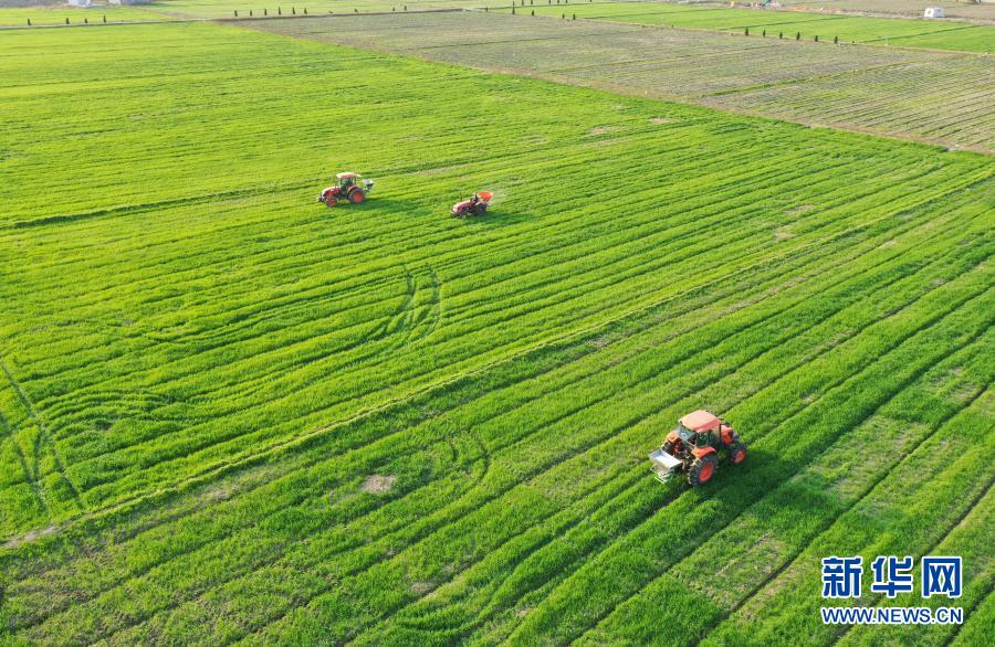 2月23日,湖州錢山下糧油專業合作社工作人員駕駛農機在田間給小麥施肥(無人機照片)。立春過后氣溫回升,浙江省湖州市吳興區道場鄉全力開展春耕工作。今年該鄉計劃播種農作物總面積1.2萬畝,其中水稻5000畝、小麥2000畝。新華社記者 翁忻旸 攝