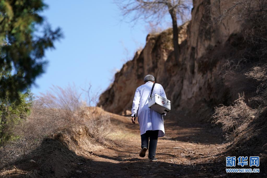 張尚保背著藥箱走在去石樓縣鐵頭村巴福山自然村的路上(3月23日攝)。新華社記者 詹彥 攝