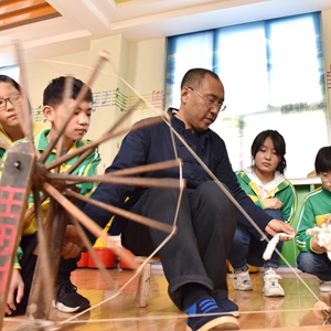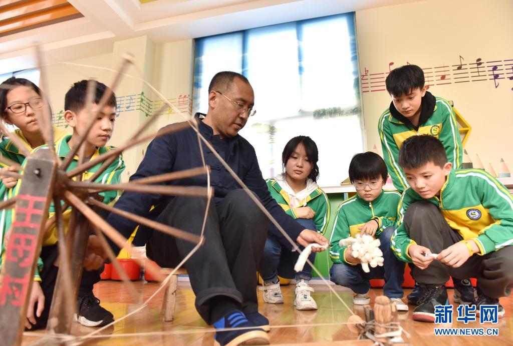 4月7日,威縣土布紡織技藝傳承人高慶海在威縣第四小學向?qū)W生演示老粗布紡織技藝。近年來,河北省邢臺市威縣積極開展“非遺傳承進校園”活動,將當?shù)靥厣沁z項目引入學校課堂,讓學生近距離感受民間傳統(tǒng)技藝的魅力,促進非遺文化的保護和傳承。新華社記者 朱旭東 攝