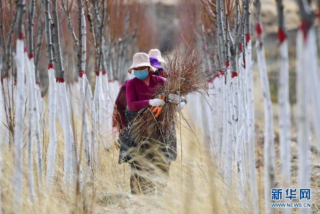 在青海省玉樹藏族自治州高原千畝林木良種繁育實驗基地,當地群眾在清理修剪過的樹枝(2020年3月29日攝)。