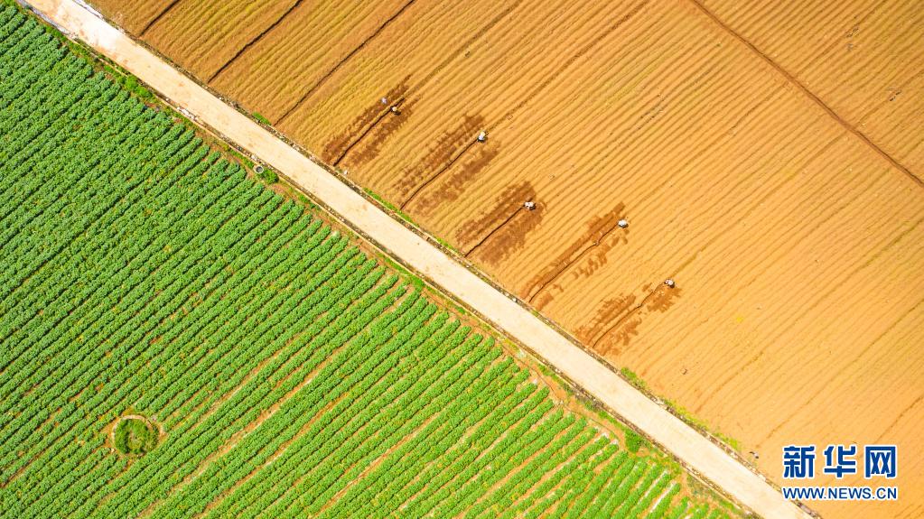 4月20日,貴州省六盤水市六枝特區木崗鎮農民在田地里勞作(無人機照片)。