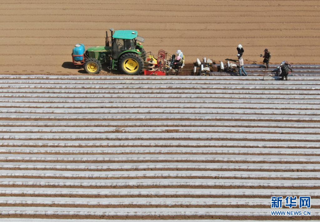 4月20日,工人操作機(jī)械設(shè)備在河北省張家口市塞北管理區(qū)農(nóng)業(yè)基地為剛播種的胡蘿卜覆膜(無人機(jī)照片)。