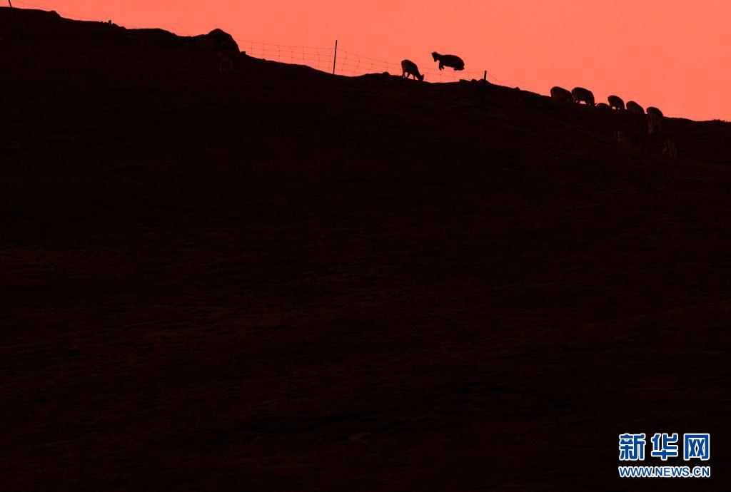 4月22日黃昏時分,在位于青海省海北藏族自治州的祁連山國家公園油葫蘆保護分區,一頭巖羊高高躍起跨越障礙。