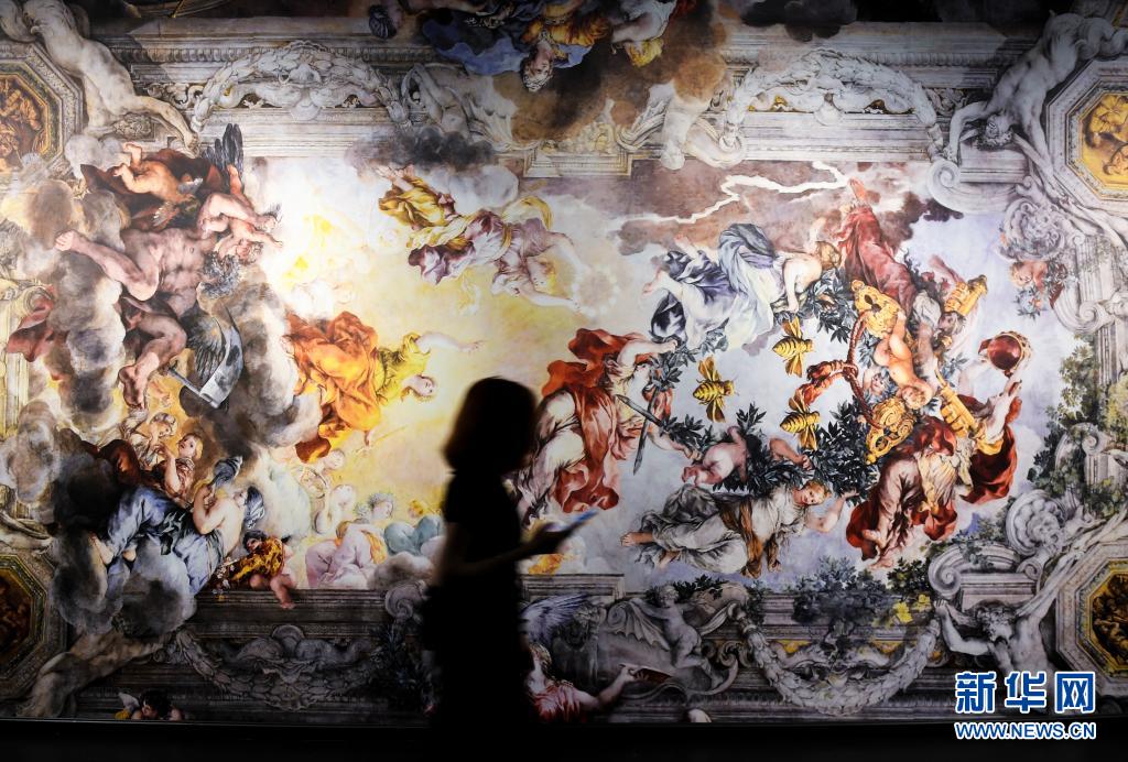 5月3日,觀眾走過展出的彼得羅·達·科爾托納壁畫作品《神意的勝利》復制品。