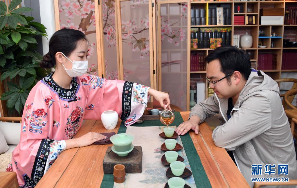 “小茶館”工作人員(左)為客人倒茶(4月29日攝)。新華社記者 任超 攝