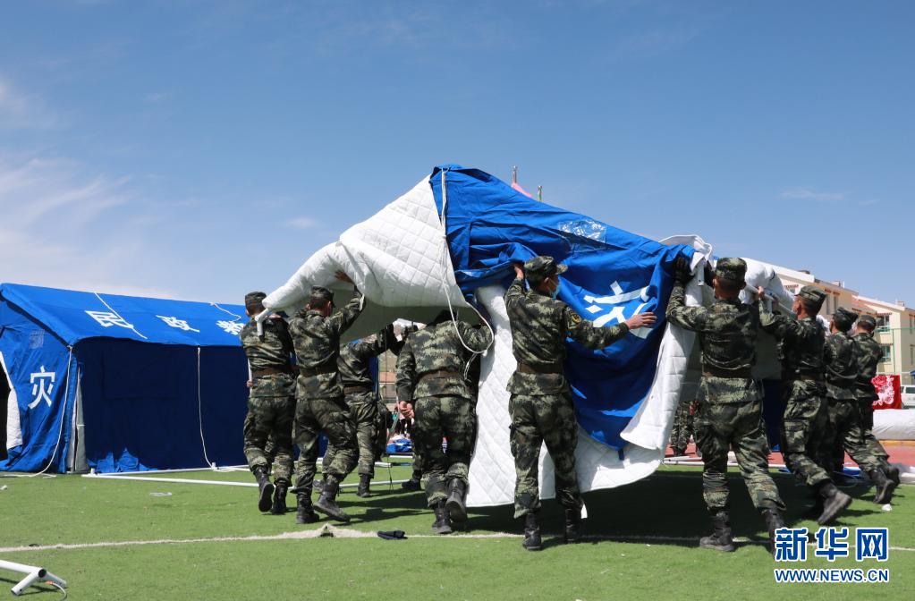 5月24日,武警青海總隊果洛支隊機動大隊官兵為花石峽鎮藏文中心寄宿制小學搭建帳篷教室。新華社記者 劉新 攝