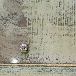 5月27日,在吉林省吉林市永吉縣一拉溪鎮九月豐家庭農場,農民駕駛農機進行水稻插秧(無人機照片)。