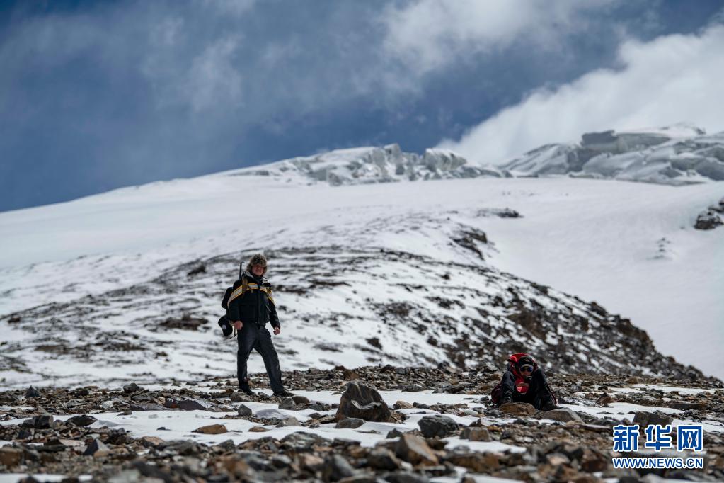 翻越一處險(xiǎn)坡后,別克米爾扎·圖爾達(dá)力(左)和同伴庫(kù)爾班巴依·努爾麥麥提在休息(5月15日攝)。新華社記者 胡虎虎 攝