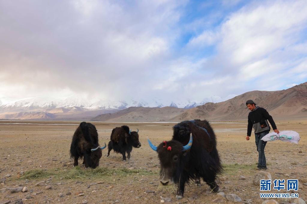 在蘇巴什村旁的牧場上,別克米爾扎·圖爾達力給剛找回來的三頭牦牛喂飼草料(5月14日攝)。新華社記者 胡虎虎 攝