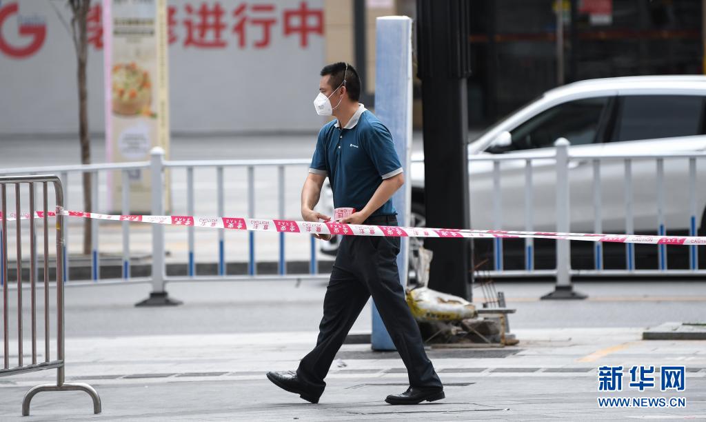 5月29日,在被納入最嚴管控范圍的廣州荔灣區白鶴洞街道廣鋼新城,物業工作人員拉起安全警戒線。新華社記者 鄧華 攝