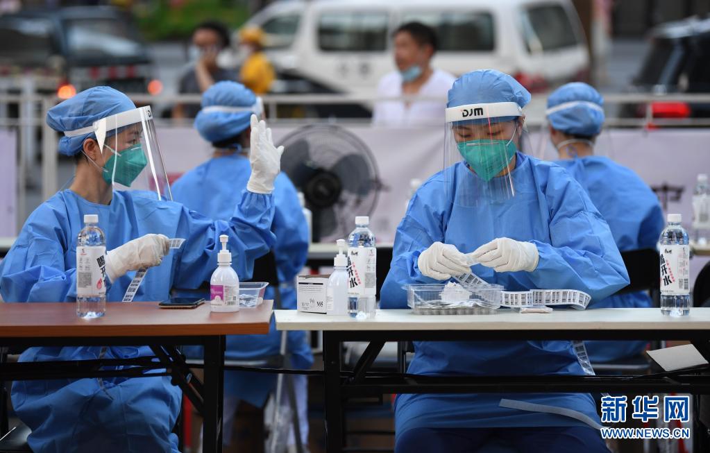 5月27日,在廣州荔灣區廣鋼新城核酸臨時采集點,南方醫科大學南方醫院的醫務人員進行檢測前的準備工作。新華社記者 鄧華 攝