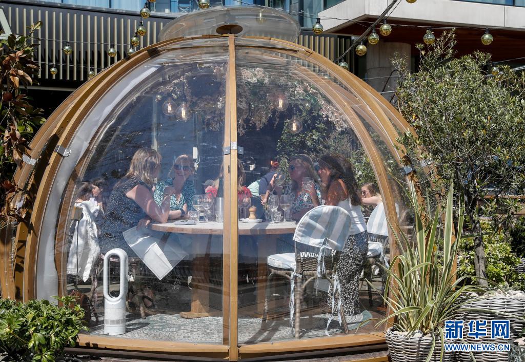 6月1日,人們在英國倫敦一家餐廳戶外就餐區的“泡泡屋”就餐。