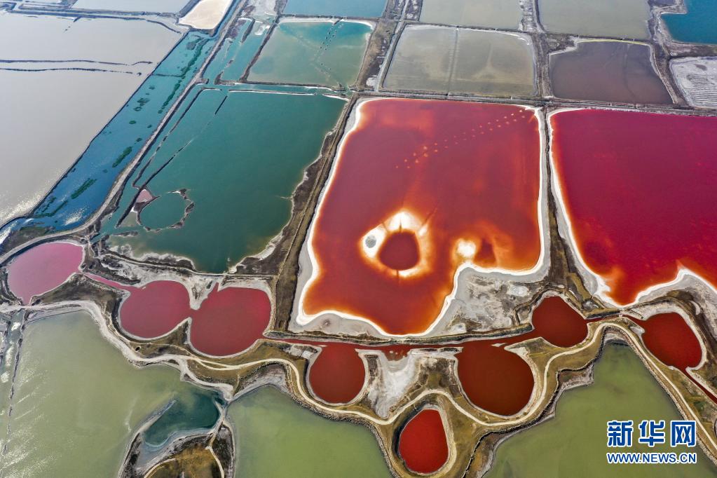 近日,隨著氣溫不斷升高,山西運城鹽湖呈現五彩斑斕的景象。