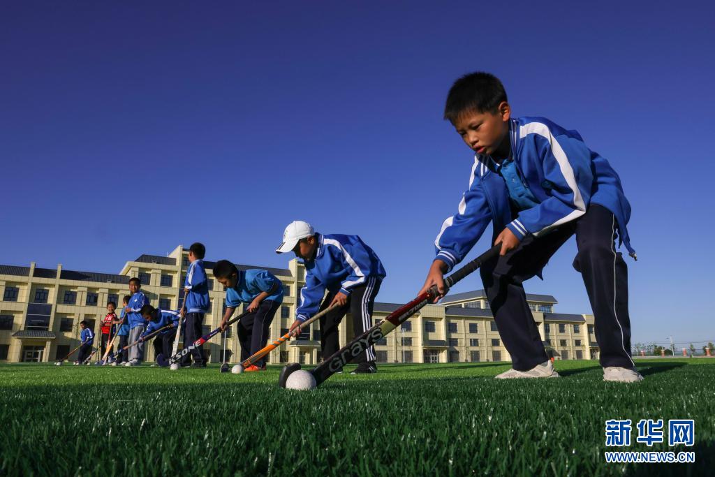 塔城市第二小學曲棍球隊的小隊員于昊天(右一)和隊友們進行撥球練習(6月13日攝)