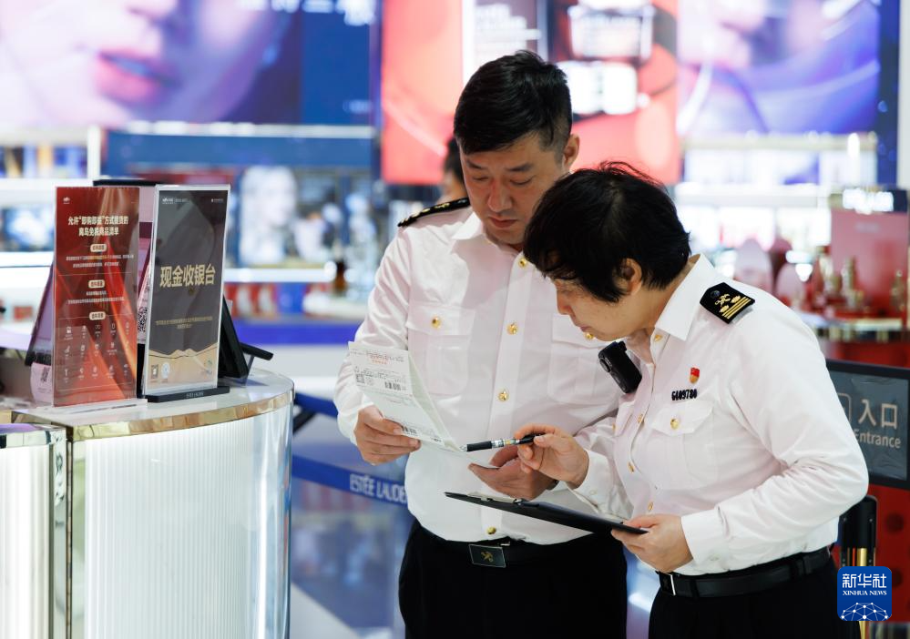 12月10日,海关工作人员在中免(海口)国际免税城一家商铺现金收银台前,排查是否有以现金形式支付的高风险人员。