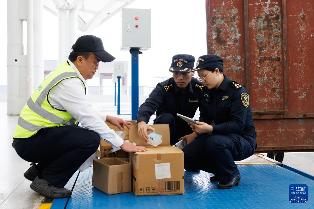12月10日,在新海港和南港“二线口岸”(货运)集中查验场查验平台,海关工作人员演练查验流程。