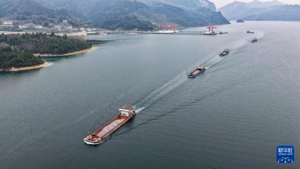 12月16日,货船从瓮安港云中港区启运出发(无人机照片)。
