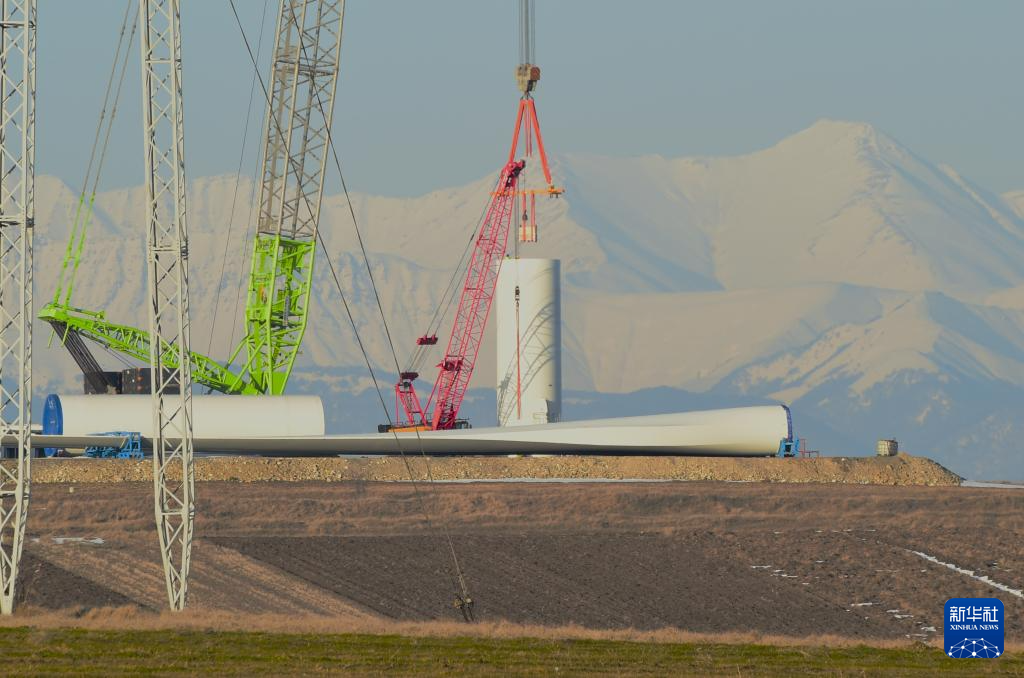 这是1月29日在格鲁吉亚什达-卡尔特里大区鲁伊西风电项目拍摄的正在吊装的风机。