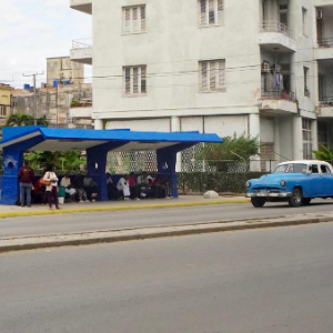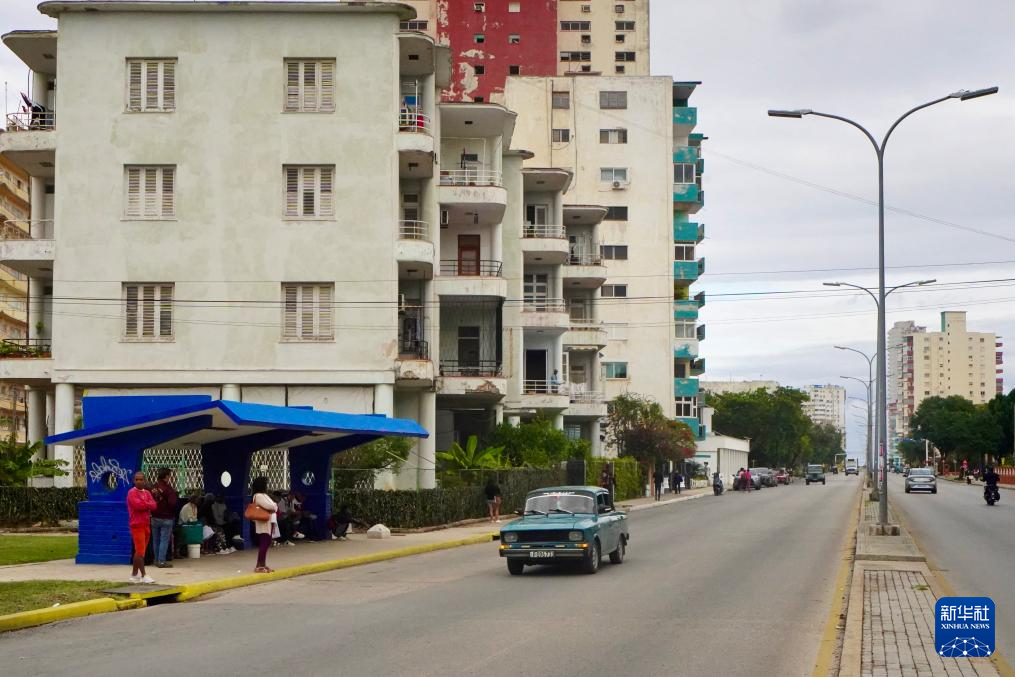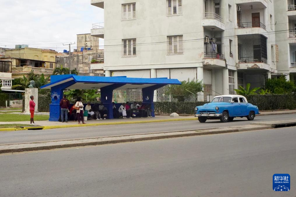 1月30日,在古巴首都哈瓦那,民众在路边一处站点等车。