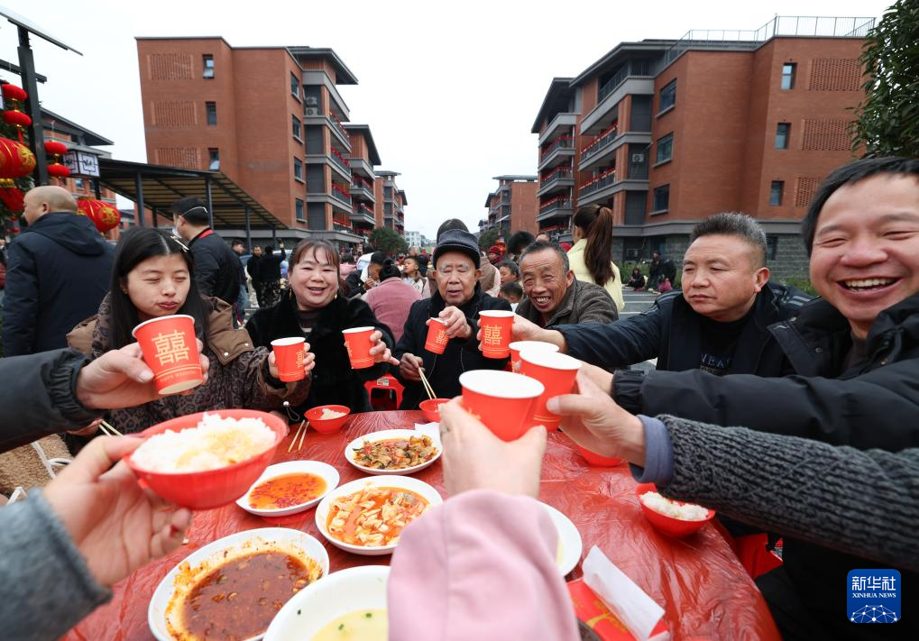 1月31日,在四川省宜宾市筠连县沐爱镇金坪村搬迁安置区,受灾群众在百家宴上举杯相互祝福。