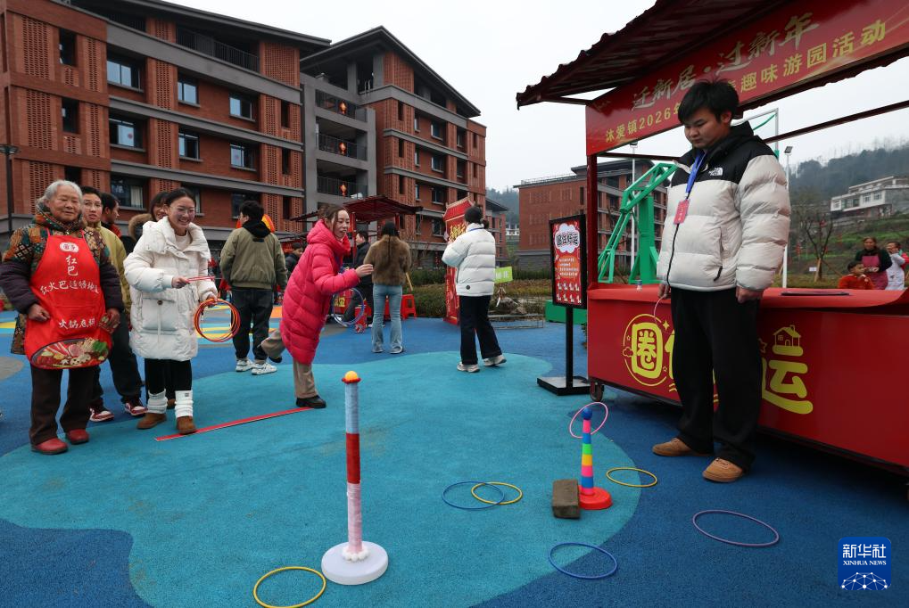 1月31日,在四川省宜宾市筠连县沐爱镇金坪村搬迁安置区,受灾群众在新居前玩游戏。