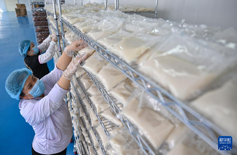 1月28日,文昌溪北邦兴食品科技有限公司糟粕醋加工厂的工作人员对袋装糟粕醋进行降温风干。