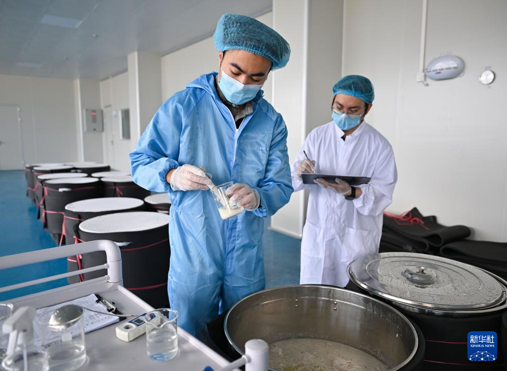 1月28日,文昌溪北邦兴食品科技有限公司糟粕醋加工厂的工作人员对糟粕醋进行采样检测。
