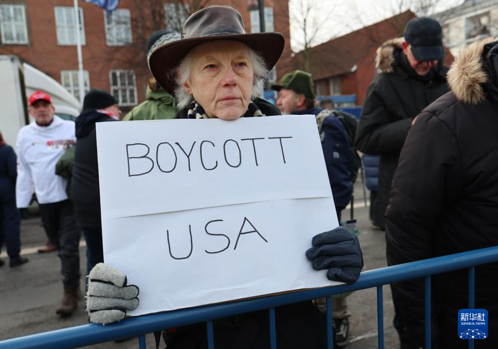 1月31日,在位于丹麦首都哥本哈根的美国驻丹麦大使馆附近,一名抗议者手举“抵制美国”的标语。