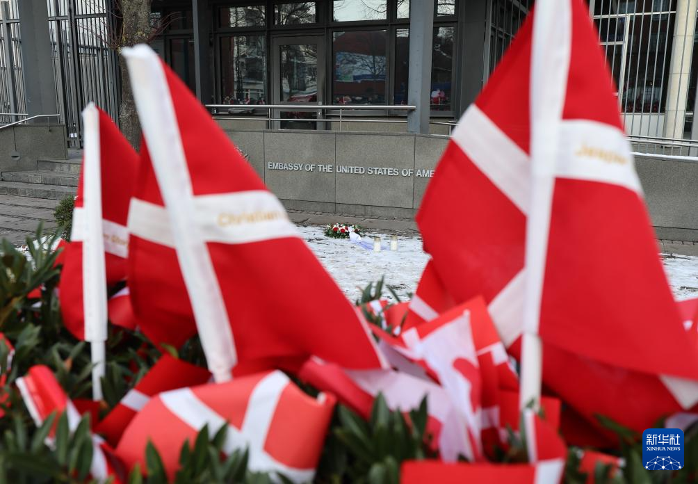 这张1月31日拍摄的照片显示的是位于丹麦首都哥本哈根的美国驻丹麦大使馆门前摆放的丹麦国旗和鲜花。