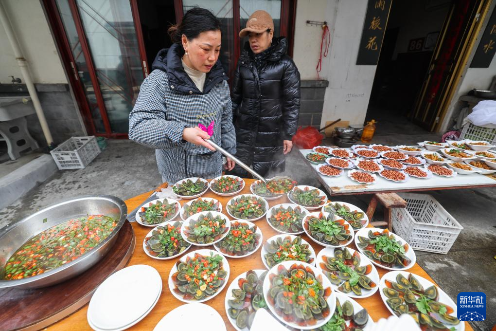 2月1日,莲花镇戴家村村民在为乡村百家宴准备特色美食。