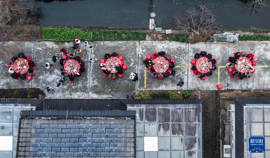 2月1日,当地百姓和游客在莲花镇戴家村品尝百家宴(无人机照片)。