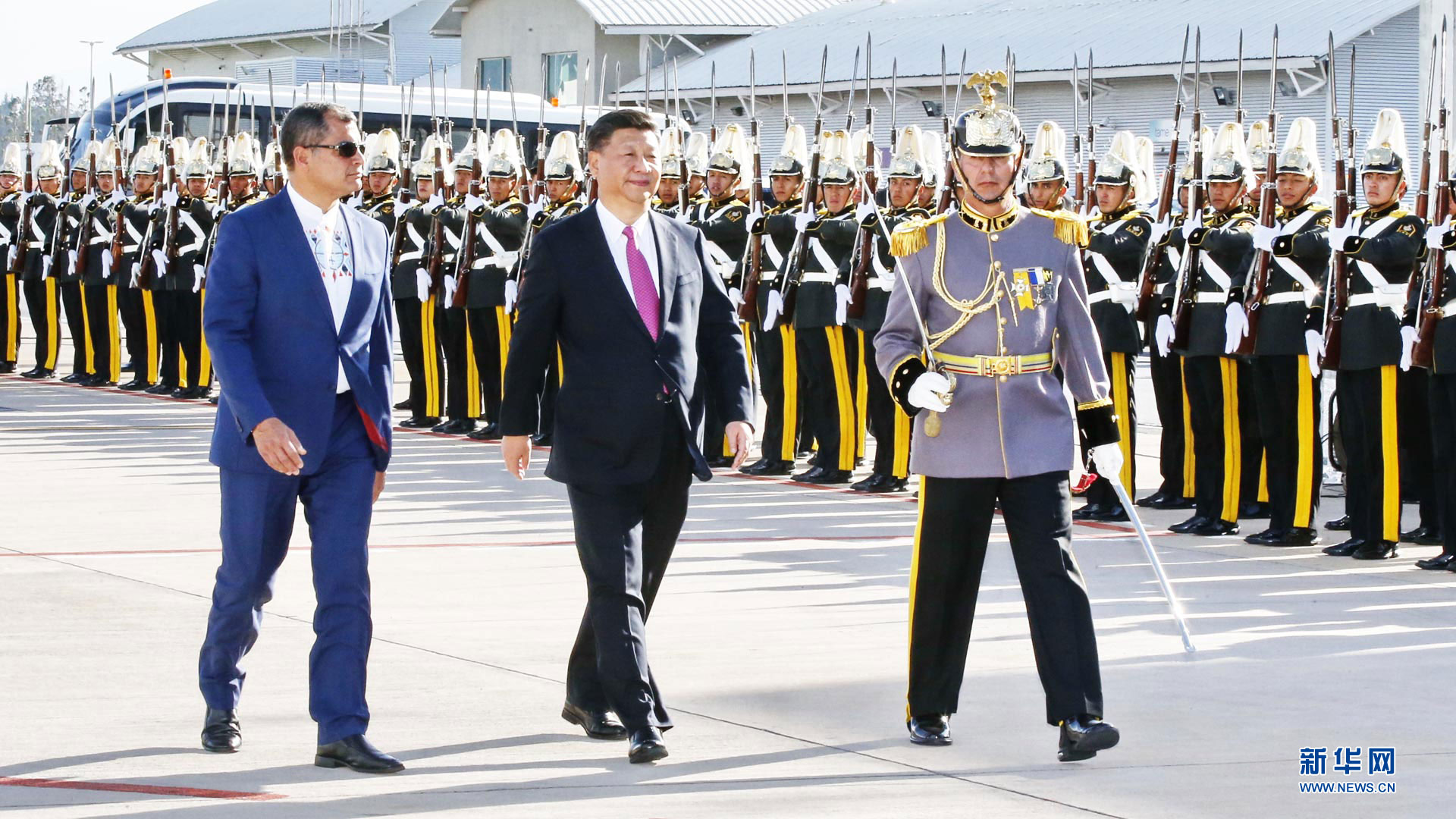 11月22日,國家主席習近平在圣地亞哥同智利總統巴切萊特舉行會談。這是會談前,習近平出席巴切萊特在憲法廣場舉行的隆重歡迎儀式。新華社記者 王曄 攝2016-11-23
