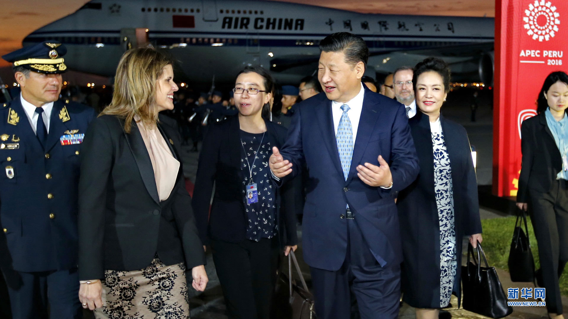當地時間11月18日,國家主席習近平抵達利馬,出席亞太經合組織第二十四次領導人非正式會議并對秘魯共和國進行國事訪問。習近平和夫人彭麗媛受到秘魯副總統阿勞斯等熱情迎接。新華社記者 丁林 攝2016-11-20