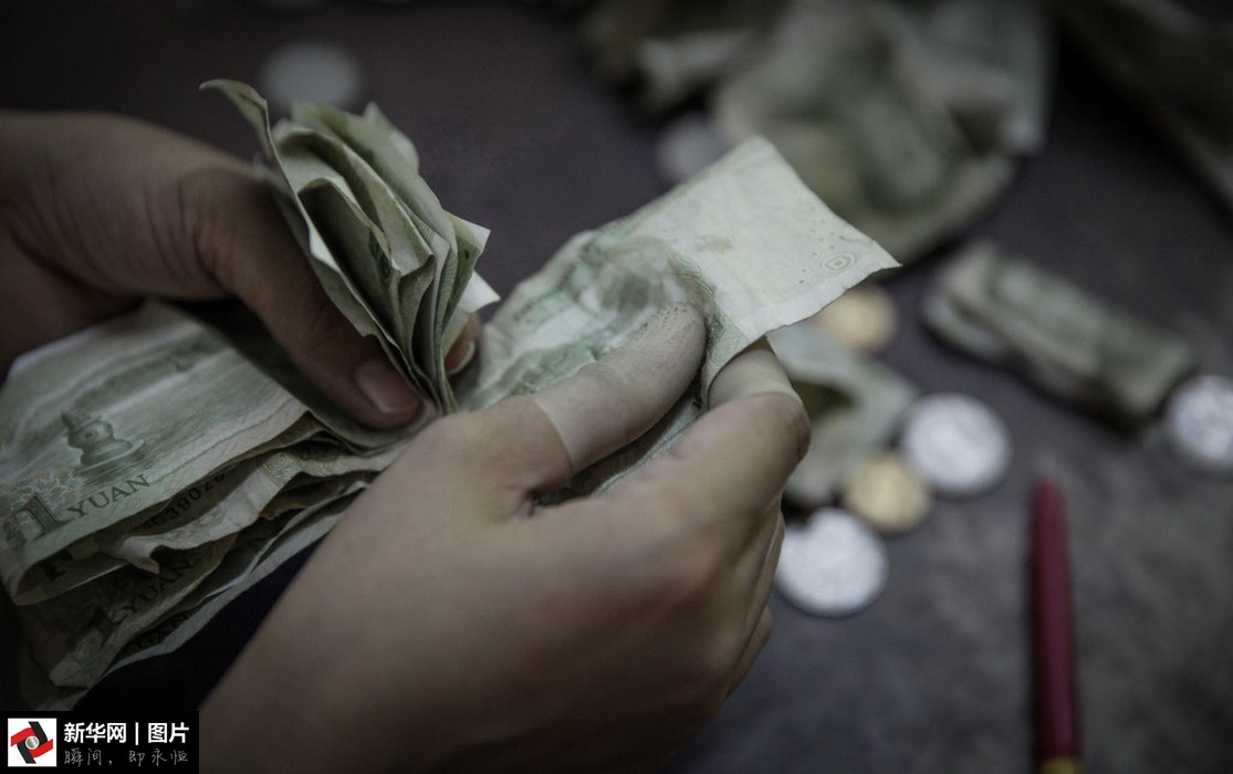 點鈔員從成堆的投幣箱內清理出零鈔準備清點。
